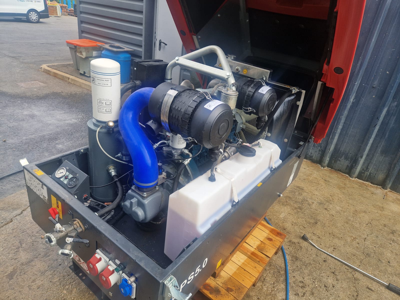 Équipé d’un moteur diesel Kubota de 33 kW et capable de délivrer un débit de 500 L/min à 7 bar. Sa génératrice intégrée de 12 kVA (230/400 V) offre en complément une source d’énergie polyvalente pour vos besoins sur site. Son poids léger de 717 kg et sa conception compacte facilitent le transport et le positionnement, même sur des chantiers urbains ou difficiles d’accès.